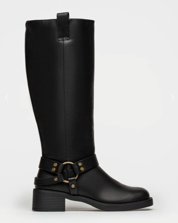 Botas caña alta de efecto cuero. Diseño estilo biker con herrajes metálicos en bronce, que cuenta con cierre en lateral interno, base de goma y plantilla soft. Un ítem ideal para looks urbanos