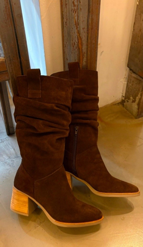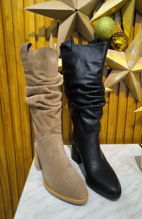Botas de CUERO, caña larga arrugada, cierre interno par un calce perfecto.