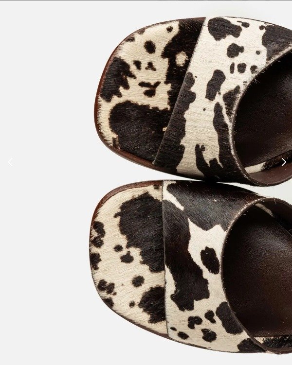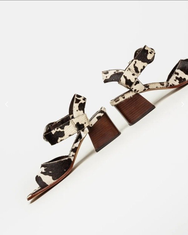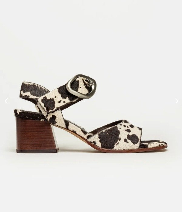 Sandalia de punta abierta Prune confeccionada en pelo print vaca. La suela cuenta con detalle de diseño metalizado estampado y plantilla soft interior para mayor confort. Se destaca en la colección por su taco foliado y la amplitud de su plantilla, que da un look innovador. La foto puede diferir del producto real. Las sandalias están confeccionadas en pelo de vaca natural y cada par es único; el color puede variar.