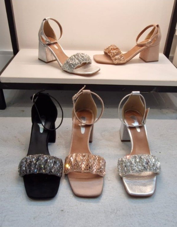 Sandalia de noche, con cinra ancha semi elástica con piedras peltre, ajuste con pulsera, taco medio.